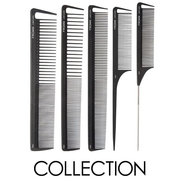 Equip your barbershop with the Fromm Limitless Carbon Combs—a premium line of durable, lightweight professional combs engineered with high carbon content for superior strength and everyday salon/barber resilience. These combs resist salon chemicals (color, bleach, relaxers) and heat up to 450°F, making them ideal for cutting, sectioning, styling, detangling, and chemical applications.