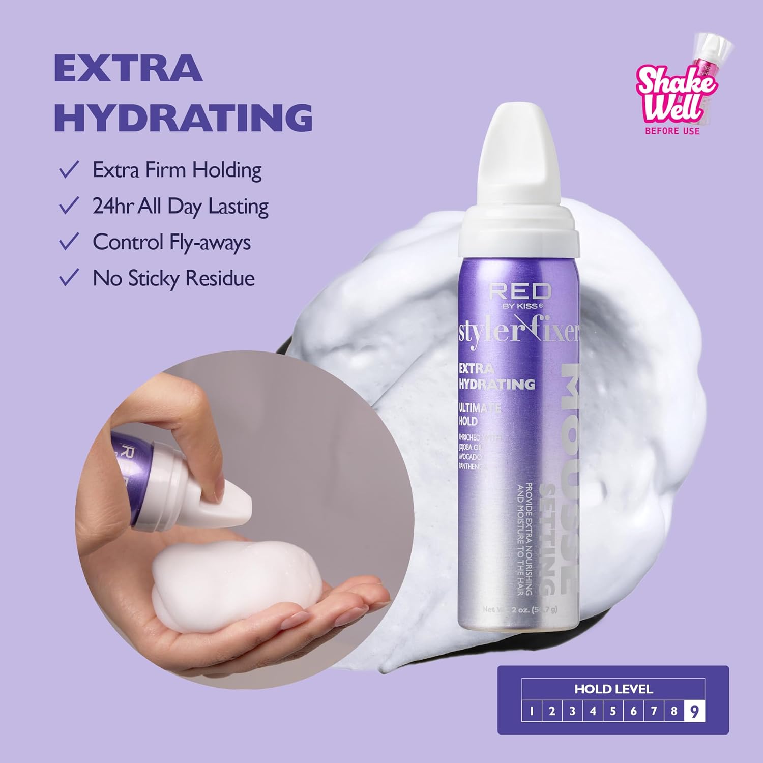The RED by KISS Styler Fixer Setting Mousse in Extra Hydrating (STM06) is the ultimate solution for reviving dry or dull curls. Powered by a rich blend of Jojoba Oil, Avocado, and Panthenol, this formula delivers intense hydration and radiant shine to thirsty hair.