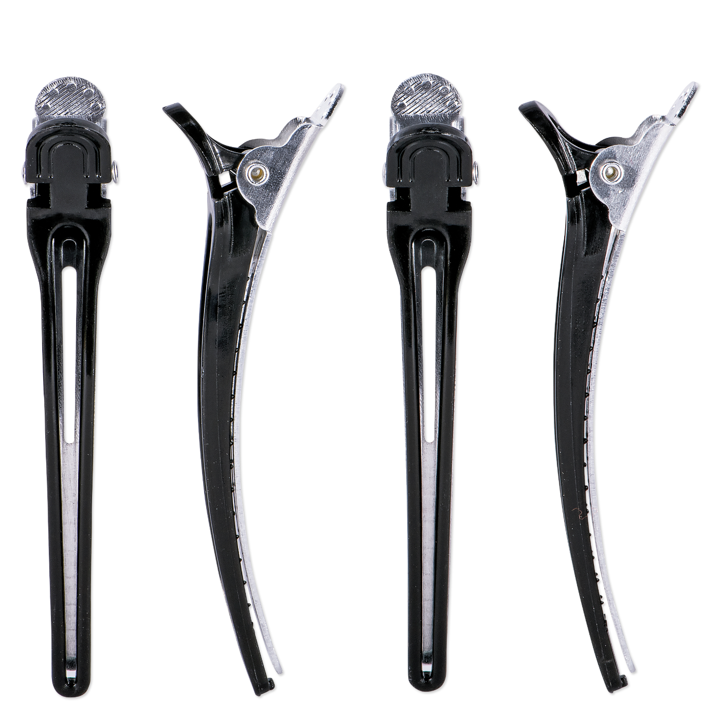 The flexible yet durable design with a slight curve contours to the head, and the tight spring allows easy open/close. 4 black clips per bag — a must-have for any professional toolkit.