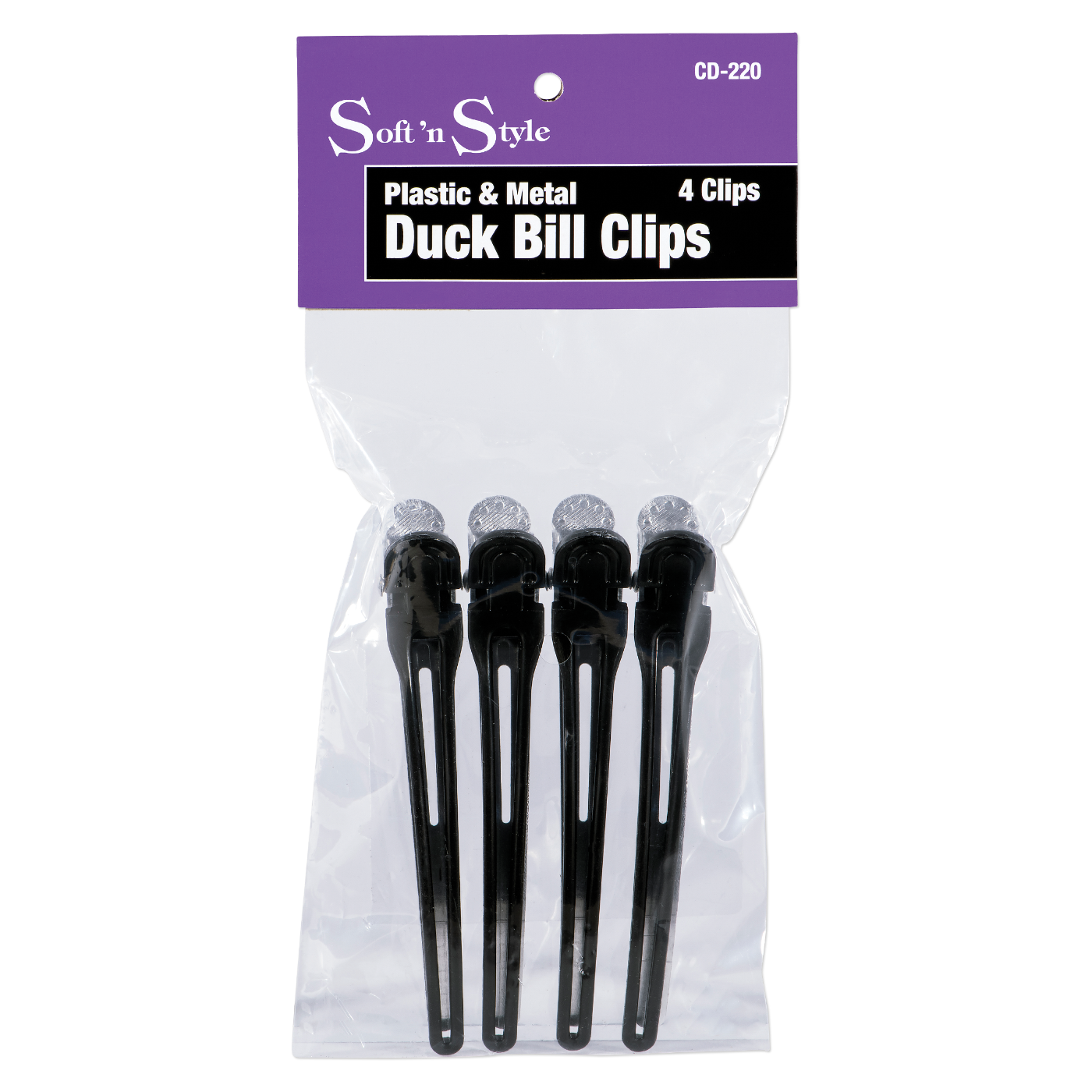 Barbers use the **Soft 'n Style Duck Bill Clips 4" 4 Pack (CD-220)** for secure sectioning during fades, beard work, and detailed cuts. Stylists rely on them for coloring, foils, and layering — these long, slim clips have plastic and metal prongs that tightly grip sections of hair without slipping.
