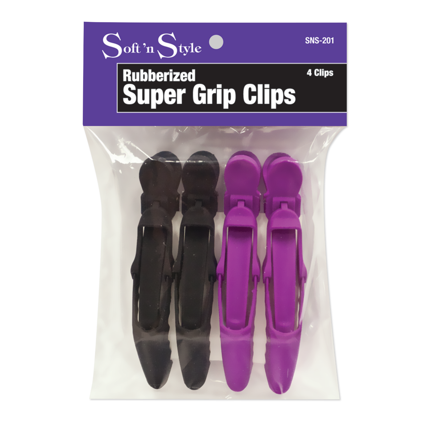 Barbers use the **Soft 'n Style Super Grip Clips Rubberized 4-1/2" 4 Pack (SNS-201)** for secure sectioning during fades, beard work, and precise cuts. Stylists rely on them for coloring, layering, and detailed styling — these large clips have rubberized, non-slip super-grip teeth that securely hold wet or dry hair without slipping.