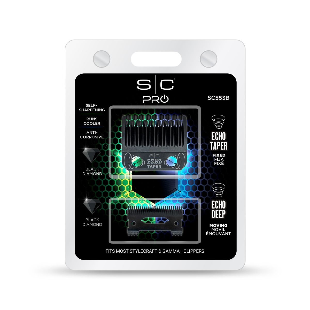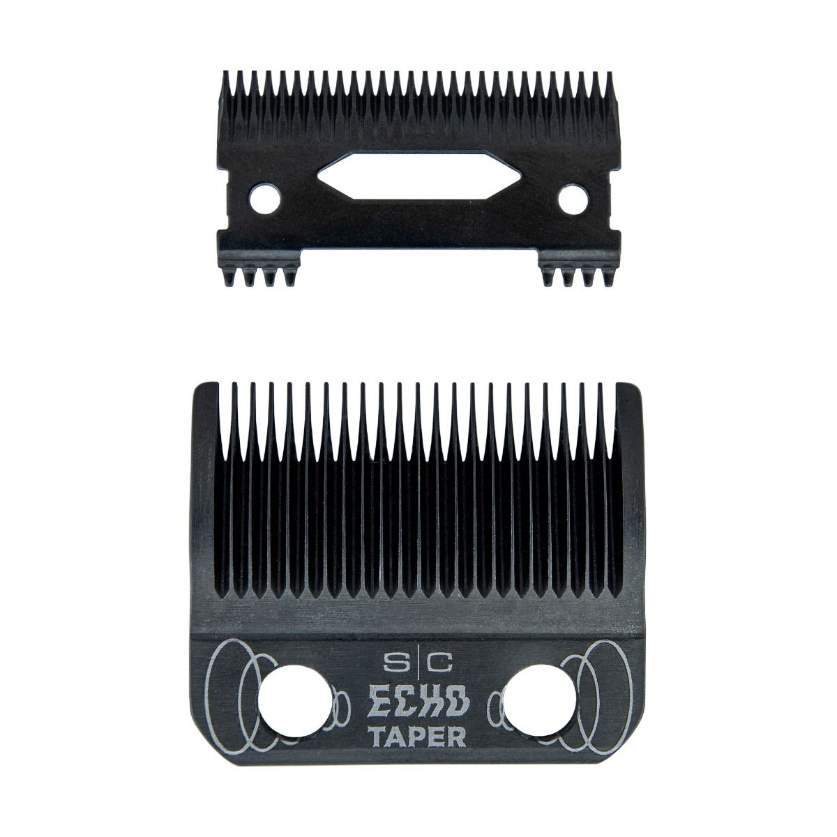 Barbers achieve crisp, close cuts, tight fades, and that signature crunch sound with the **Stylecraft Echo Taper Black DLC Clipper Blade (SC553B)**. This premium set includes the Echo Taper Blade and Deep Tooth Cutter, crafted from Black Diamond Carbon (DLC) material for rust-proof durability, cooler operation, and self-sharpening endurance that stays sharper longer than standard stainless steel.
